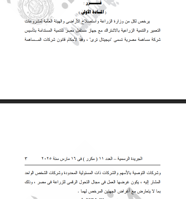 يرخص لكل من وزارة الزراعة واستصلاح الأراضي والهيئة العامة لمشروعات التعمير والتنمية الزراعية بالاشتراك مع جهاز مستقبل مصر للتنمية المستدامة بتأسيس شركة مساهمة مصرية تسمى ديجيتال ترى، وفقا لأحكام قانون شركات المساهمة وشركات التوصية بالأسهم والشركات ذات المسئولية المحدودة وشركات الشخص الواحد المشار إليه، يكون غرضها العمل في مجال التحول الرقمي للزراعة في مصر، وذلك بما لا يتعارض مع أغراض الجهتين المرخص لهما.