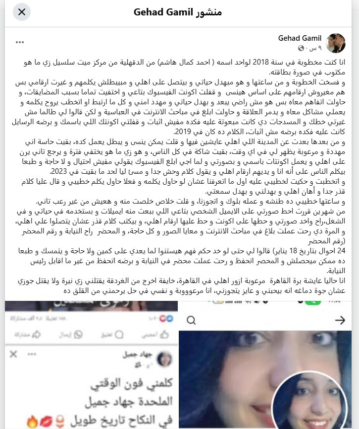 وقالت جهاد جميل في منشورها: أنا كنت مخطوبة في سنة 2018 لواحد اسمه ( أحمد كمال هاشم) من الدقهلية من مركز ميت سلسيل زي ما هو مكتوب في صورة بطاقته وفسخت الخطوبة ومن ساعتها وهو مبهدل حياتي وبيتصل على أهلي ومبيبطلش يكلمهم وغيرت أرقامي بس هم مغيروش أرقامهم على أساس هينسى وقفلت اكونت الفيسبوك بتاعي واختفيت تماما بسبب المضايقات.