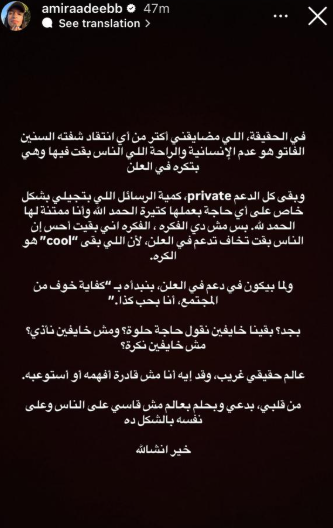 ونشرت أميرة أديب ستوري عبر حسابها الشخصي بموقع تبادل الصور والفيديوهات القصيرة "إنستجرام"، قالت فيها: "في الحقيقة، اللي مضايقني أكثر من أي انتقاد شفته السنين الفاتوا، هو عدم الإنسانية والراحة اللي الناس بقت فيها وهي بتكره في العلن، وبقى كل الدعم خاص. كمية الرسائل اللي بتجيلي بشكل خاص على أي حاجة بعملها كثيرة، الحمد لله، وأنا ممتنة لها، الحمد لله، بس مش دي الفكرة. الفكرة إني بقيت أحس إن الناس بقت تخاف تدعم في العلن، لأن اللي بقى "cool" هو الكرة".