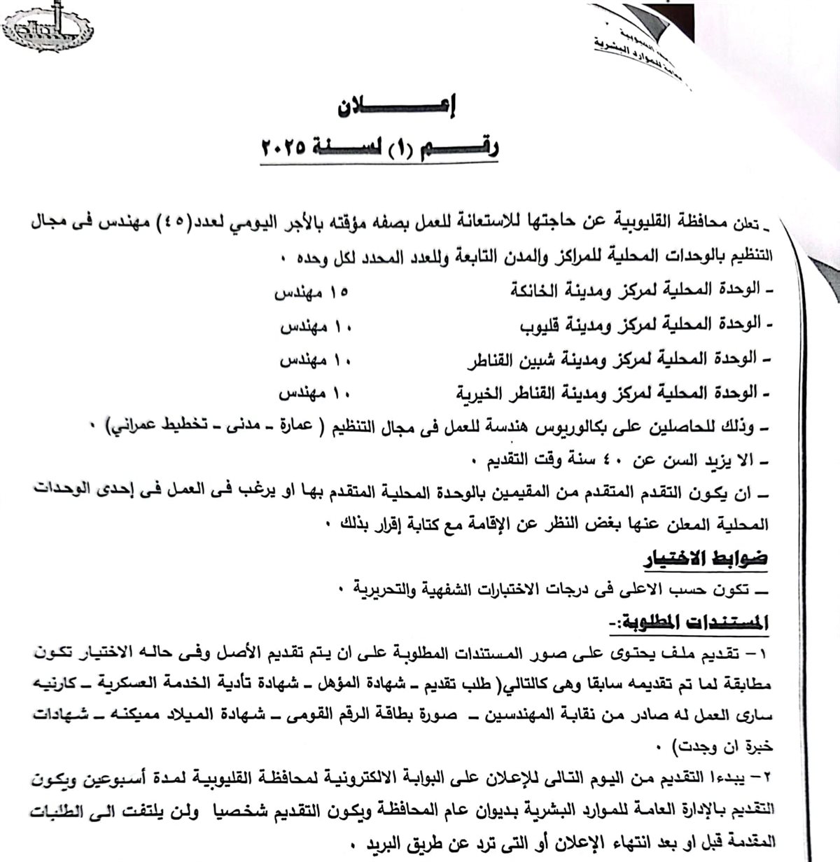 القليوبية تعلن حاجتها لـ 45 مهندسا للعمل بالوحدات المحلية بنظام السركي اليومي .. اعرف الشروط