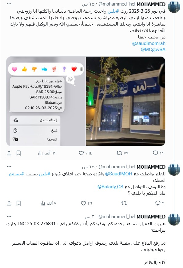 وكتب على تويتر: في يوم 26-3-2025 زرت بـ لبن وأخذت وجبة الماضية بالمانجا وأكلتها أنا وزوجتي، وأطعمت ابنتي الرضيعة منها، مباشرة تسممت زوجتي وأدخلتها المستشفى، وبعدها مباشرة أنا وابنتي ودخلنا المستشفى جميعًا، حسبي الله ونعم الوكيل فيهم ولا بارك الله لهم، لأننا نعاني.