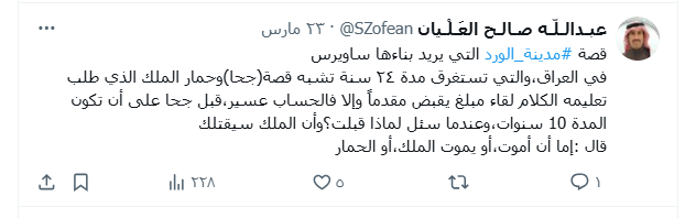 وقال ثالث: في العراق، التي تستغرق مدة 24 سنة تشبه قصة جحا وحمار الملك الذي طلب تعليمه الكلام لقاء مبلغ يقبض مقدمًا، وإلا فالحساب عسير، قبل جحا على أن تكون المدة 10 سنوات، وعندما سئل لماذا قبلت؟ وأن الملك سيقتلك قال: إما أن أموت، أو يموت الملك، أو الحمار.