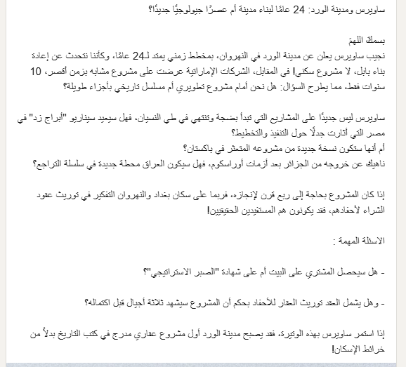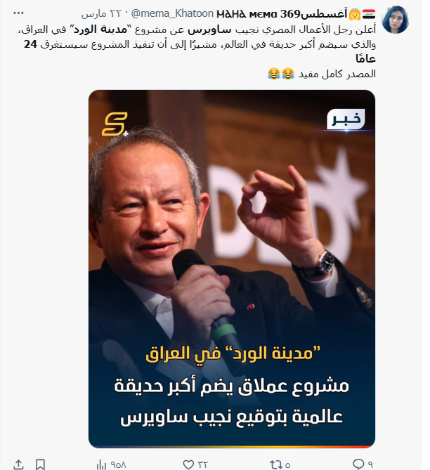 بينما كتب آخر: ساويرس ليس جديدًا على المشاريع التي تبدأ بضجة وتنتهي في طي النسيان، فهل سيعيد سيناريو أبراج زد في مصر التي أثارت جدلًا حول التنفيذ والتخطيط؟ أم أنها ستكون نسخة جديدة من مشروعه المتعثر في باكستان؟ ناهيك عن خروجه من الجزائر بعد أزمات أوراسكوم، فهل سيكون العراق محطة جديدة في سلسلة التراجع؟.