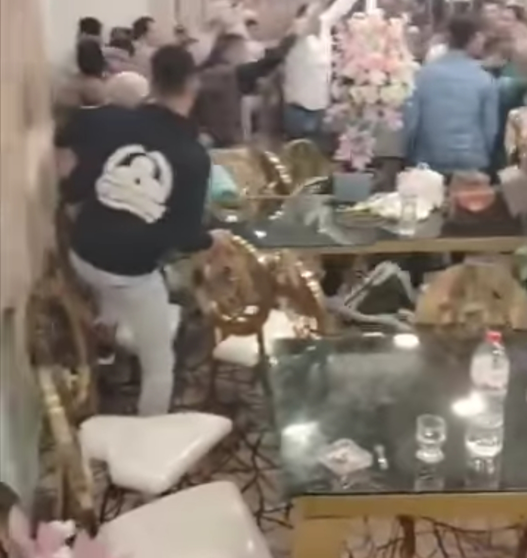 وظهر في مقطع الفيديو المتداول إلقاء طرفي المشاجرة كراسي القاعة على بعضهم البعض، وسادت حالة من الفزع والهلع بين المعازيم الذين بادر غالبيتهم بالخروج من قاعة الأفراح.