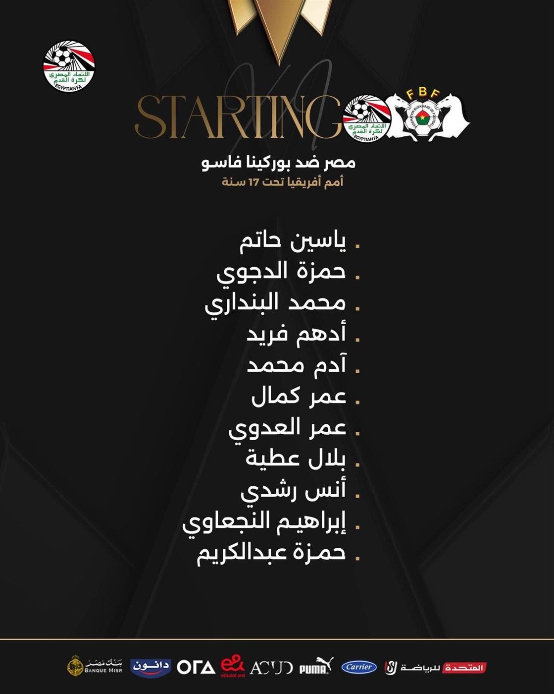 أعلن الجهاز الفني لمنتخب مصر لكرة القدم تحت 17 عامًا، بقيادة المدرب الوطني، التشكيل الرسمي للفريق في مباراته المرتقبة أمام منتخب بوركينا فاسو، ضمن منافسات البطولة الإفريقية للشباب.