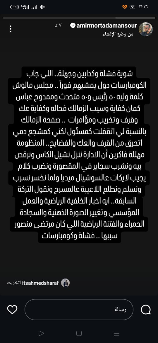 وكتب أمير مرتضى منصور عضو مجلس إدارة الزمالك السابق عبر حسابه على انستجرام: شوية فشلة وكدابين وجهلة.. مجلس ملوش كلمة وليه 50 رئيس و50 متحدث وممدوح عباس كمان، كفاية وسيب الزمالك فحاله وكفاية عك وقرف وتخريب ومؤامرات.