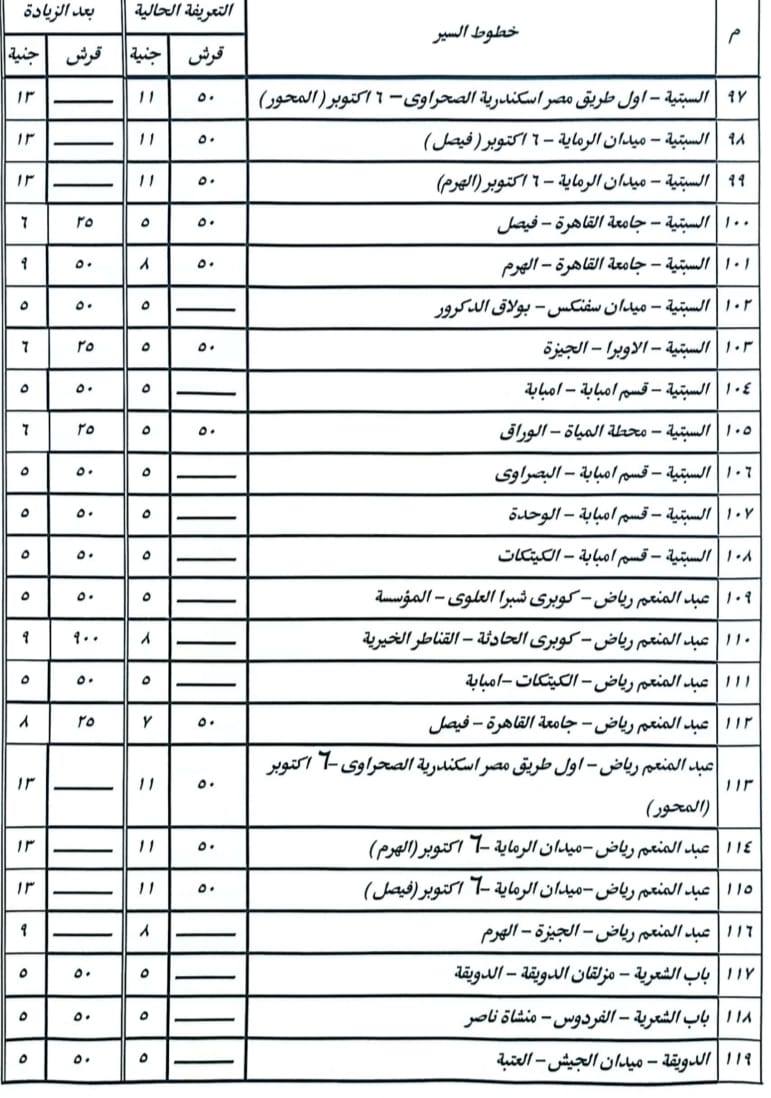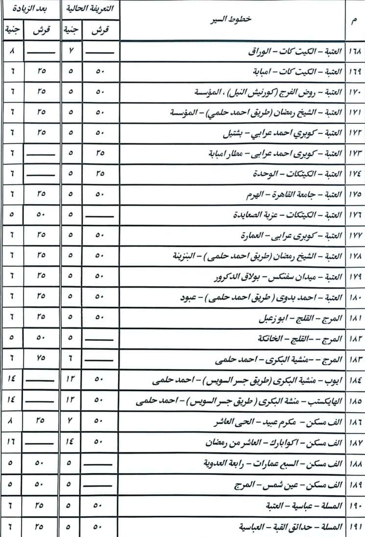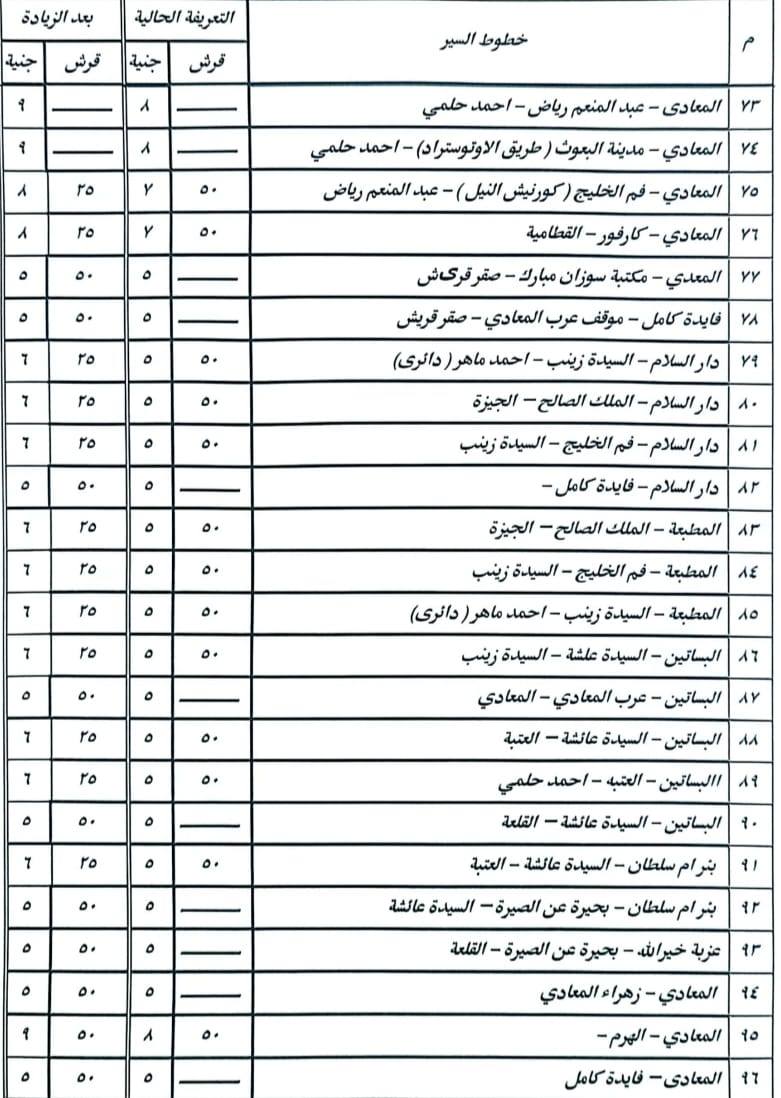 وأشار محافظ القاهرة إلى أنه تم مراعاة مصلحة المواطن والسائق فى التعريفة الجديدة، وكانت الزيادة ١٠% على معظم الخطوط، ولم تتجاوز ١٥% فى الخطوط الطويلة.