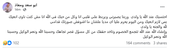وقال والد سعد في منشور عبر حسابه الشخصي بفيسبوك: أحتسبك عند الله يا ولدي، وربنا يصبرني ويربط على قلبي أنا وكل من أحبك في الله، لم أكن أنوي أن أنعيك، لكن كان لا بد أن أودّعك بكلمات تليق بك، ومن اليوم أحرم على نفسي أي تواجد في الإعلام أو مواقع التواصل، لأني لا أتحمل أن أرى صورتك أمامي.