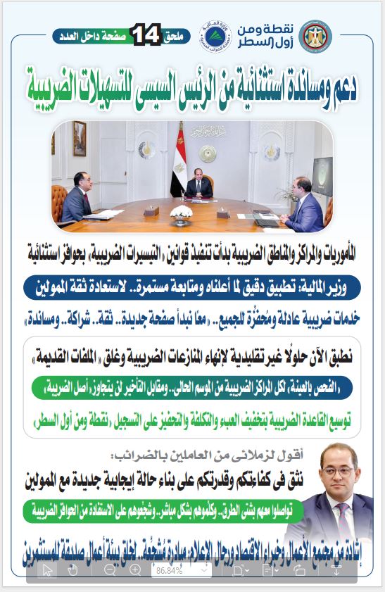 أضاف: نستهدف تقديم خدمات ضريبية عادلة ومحفزة لجميع الممولين.. «معًا.. نبدأ صفحة جديدة.. ثقة.. شراكة.. ومساندة»، وقد درسنا سويًا التحديات الضريبية، وحددنا الأولويات، ودخلت حزمة التيسيرات حيز التنفيذ، والآن نُطبق حلولًا غير تقليدية لإنهاء المنازعات الضريبية وغلق «الملفات القديمة»، وأصبح نظام الفحص بالعينة يشمل كل المراكز الضريبية بدءًا من الموسم الحالى، وأن مقابل التأخير لن يتجاوز «أصل الضريبة».