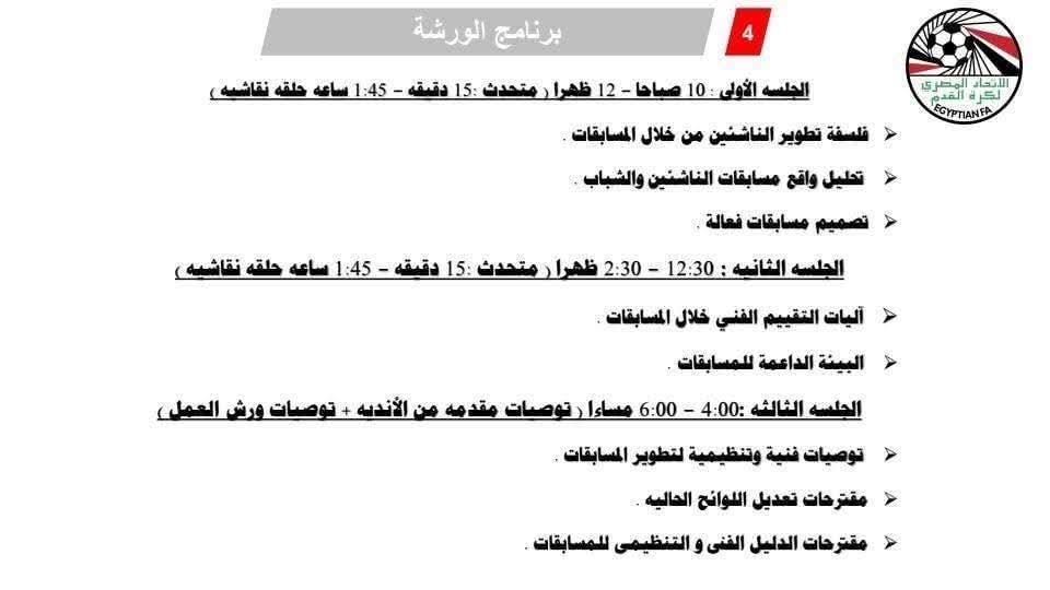وجاءت الدعوة الموجهة إلى الأندية في إطار التطوير الذي ينتهجه الاتحاد المصري لكرة القدم مؤخرًا، ويشرف على ورشة العمل وليد درويش عضو مجلس إدارة الاتحاد المصري لكرة القدم، كما تشهد الورشة حضور أعضاء اللجنة الفنية باتحاد الكرة والتي تضم عددا من نجوم كرة القدم المصرية السابقين.