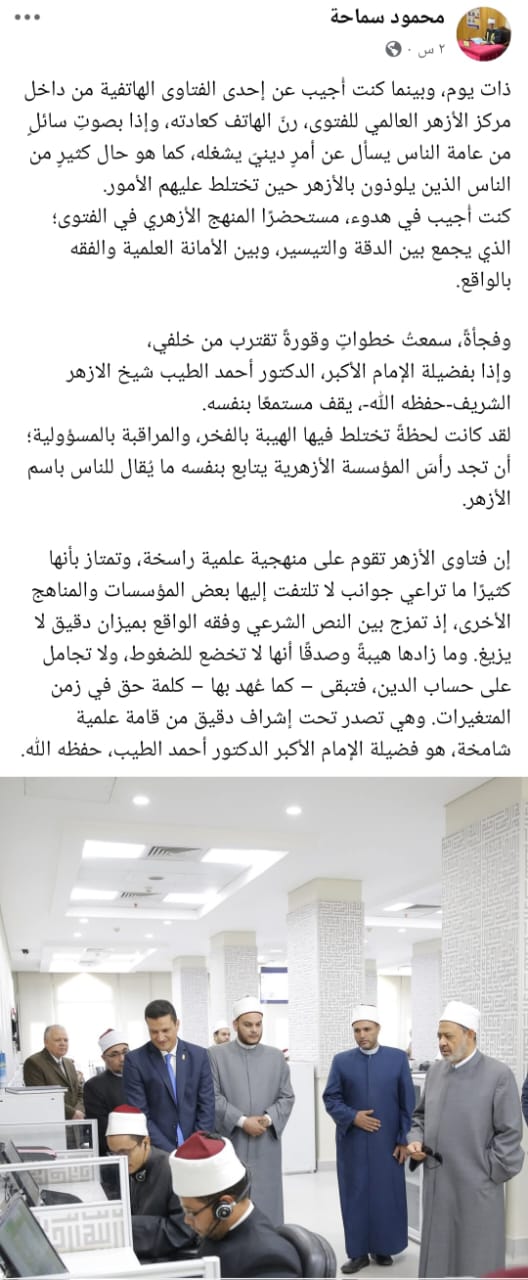 وكتب عبر حسابه على موقع التواصل الاجتماعي فيس بوك: ذات يوم، وبينما كنت أُجيب عن إحدى الفتاوى الهاتفية من داخل مركز الأزهر العالمي للفتوى، رنّ الهاتف كعادته، وإذا بصوتِ سائلٍ من عامة الناس يسأل عن أمرٍ دينيّ يشغله، كما هو حال كثيرٍ من الناس الذين يلوذون بالأزهر حين تختلط عليهم الأمور.