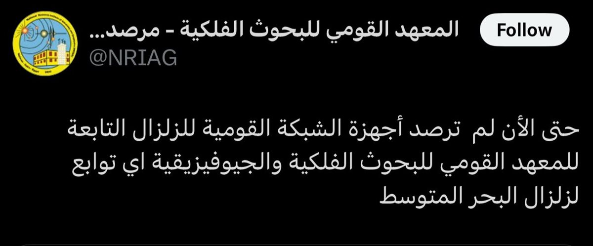 وأكد القومي للبحوث الفلكية في بيان له منذ قليل، على أنه لم يتم رصد أي توابع لزلزال البحر المتوسط، من قبل أجهزة الشبكة القومية للزالزل والتابعة للمعهد القومي للبحوث الفلكية.