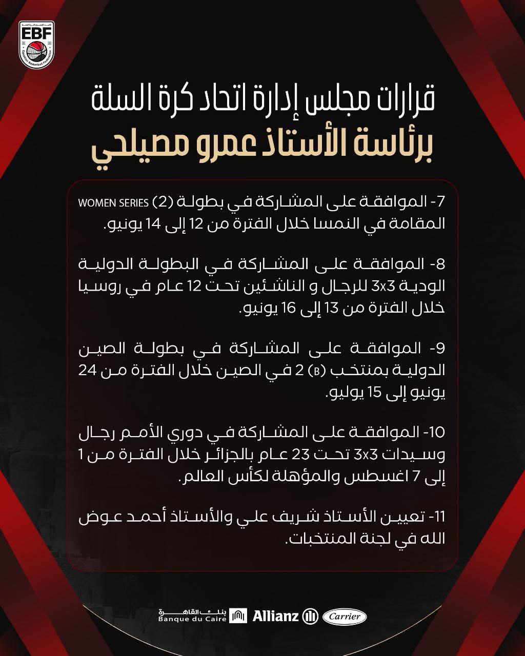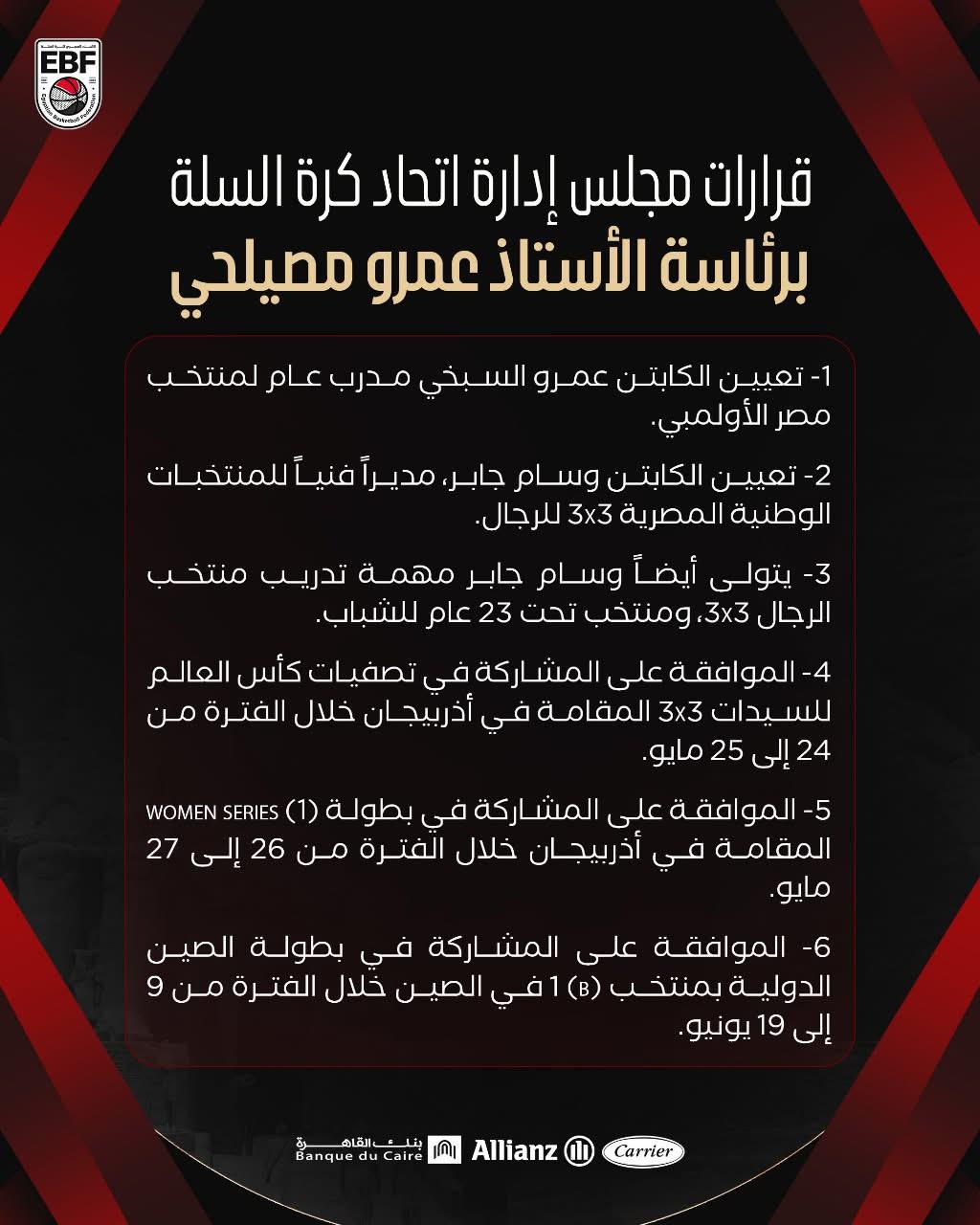 أصدر مجلس إدارة الاتحاد المصري لكرة السلة، برئاسة عمرو مصيلحي، عددًا من القرارات المهمة خلال اجتماعه الأخير، في إطار سعيه لتطوير المنتخبات الوطنية ودعم مشاركة مصر في البطولات الدولية المختلفة، خاصة في منافسات 3×3 التي تشهد تطورًا متسارعًا.