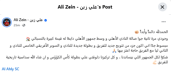 واختتم زين تصريحاته برسالة شكر للجماهير، قائلًا: شكرًا لكل الجمهور اللي بيساندنا.. وكل تركيزنا دلوقتي على بطولة كأس الكؤوس، وإن شاء الله نحقق سداسية تاريخية للفريق.