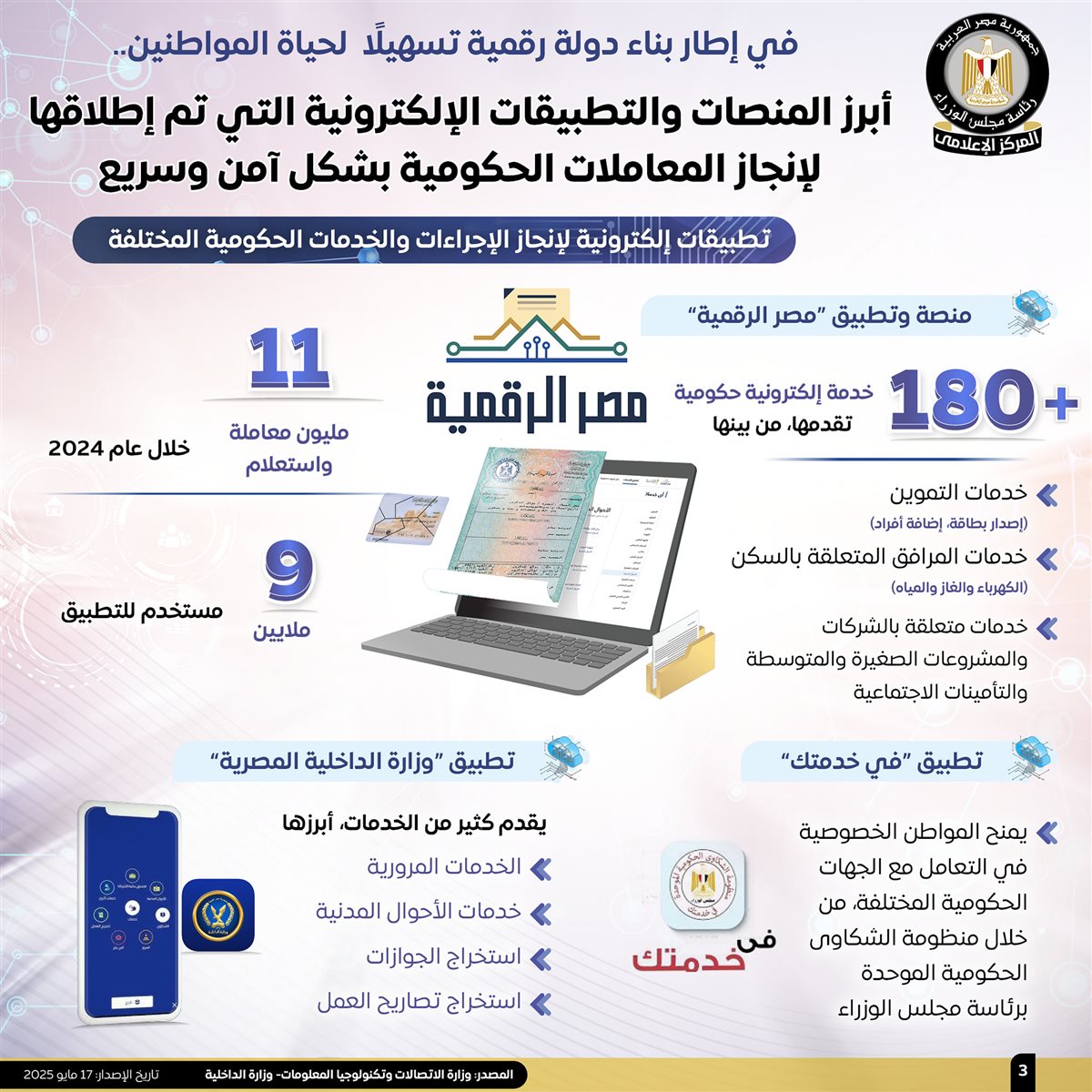 استعرض المركز الإعلامي لمجلس الوزراء، أبرز المنصات والتطبيقات الإلكترونية التي تم إطلاقها لإنجاز المعاملات الحكومية بشكل آمن وسريع وذلك في إطار بناء دولة رقمية تسهيلًا لحياة المواطنين.