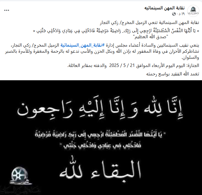 وأردفت: ينعي نقيب السينمائيين وأعضاء مجلس إدارة نقابة المهن السينمائية الزميل المخرج زكي النجار، نشاطركم الأحزان في وفاة المغفور له بإذن الله وبكل الحزن والأسى ندعو له بالرحمة والمغفرة وللأسرة بالصبر والسلوان.