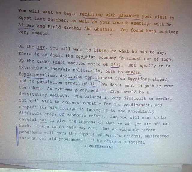 بل أن تاتشر شددت على ضرورة "وضع أهداف صعبة" لمصر، مع بعض المرونة في التنفيذ، ولكن دون أن يُفهم أن الغرب سيتساهل مع الفوضى المالية في القاهرة.