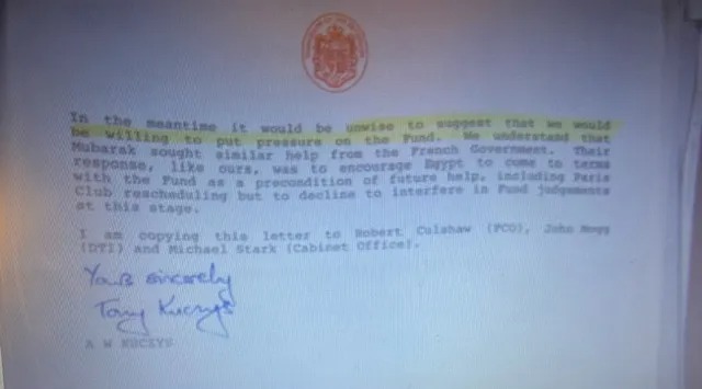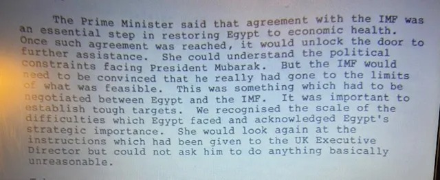 ومع أن تاتشر أعربت عن "تفهمها" لأوضاع مصر، إلا أنها رفضت التدخل المباشر في موقف ممثلي بريطانيا داخل صندوق النقد، واكتفت بإبداء "التعاطف من بعيد".