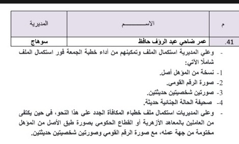 وعلى المديرية إستكمال ملف الخطباء الجدد على هذا النحو من العاملين بالمعاهد الازهرية او القطاع الحكومي بصورة طبق الاصل من المؤهل مختومة من جهة عملة مع صورة الرقم القومي وصورتين شخصيتين حديثتين.