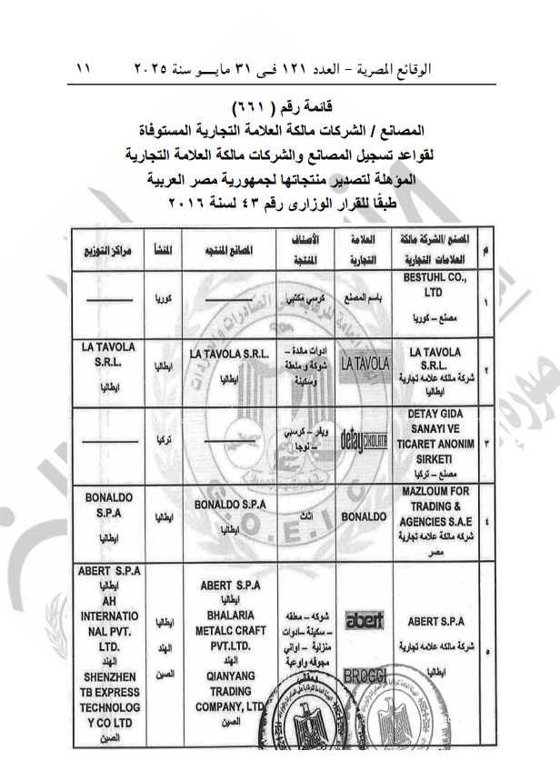ونصت المادة الأولى من القرار على أن تقيد المصانع والشركات مالكة العلامة التجارية المبينة أسماؤها بالقوائم المرفقة رقم 661 طبقا للقرار الوزارى رقم 43 لسنة 2016 في سجل المصانع والشركات مالكة العلامة التجارية المؤهلة لتصدير منتجاتها إلى جمهورية مصر العربية والمنشأ لهذا الغرض بالهيئة العامة للرقابة على الصادرات والواردات.