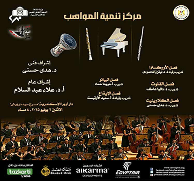 ضمن أنشطة وزارة الثقافة تنظم دار الأوبرا المصرية، برئاسة الدكتور علاء عبد السلام، حفلًا للواعدين بمركز تنمية المواهب بإشراف فني للدكتورة هدى حسني، وذلك في الثامنة مساء الأثنين 2 يونيو على مسرح سيد درويش أوبرا الإسكندرية.