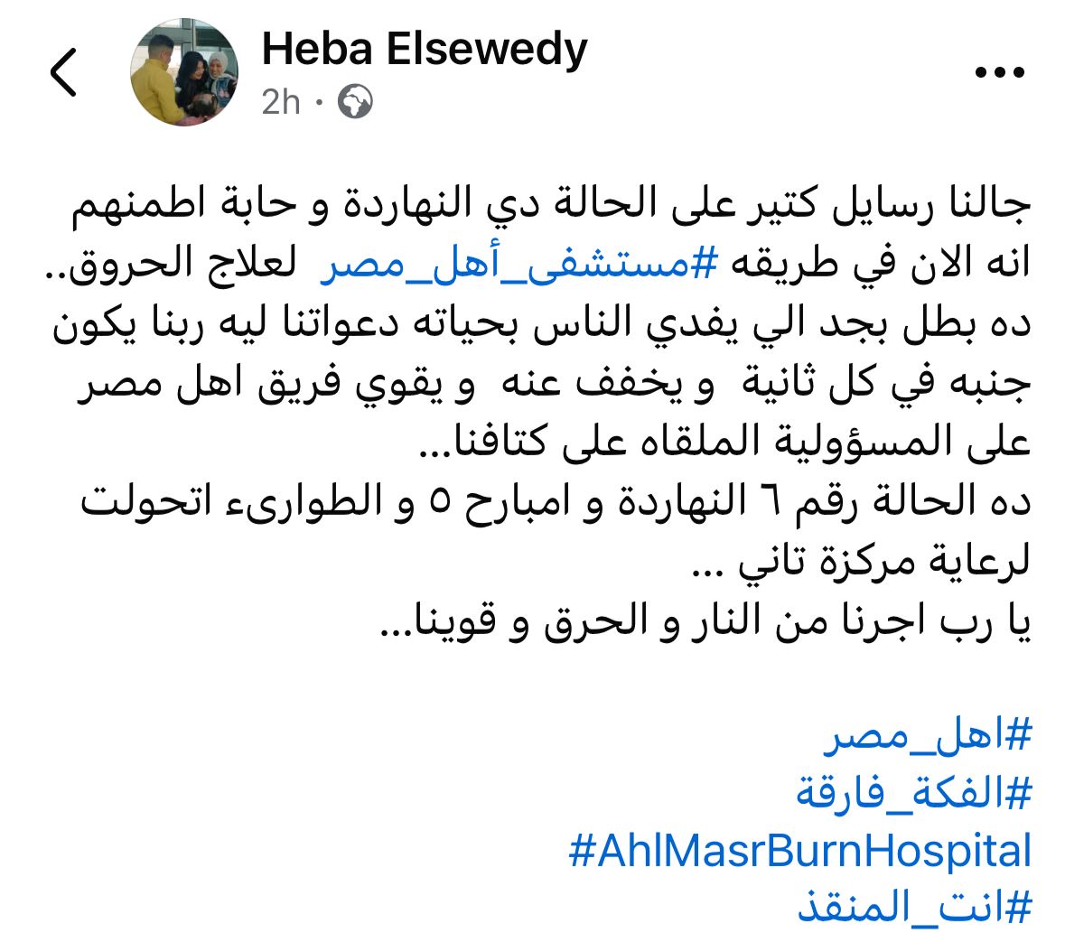 ورغم تعرض الأسطى خالد لحروق بالغة، استطاع أن يبعد السيارة المشتعلة عن محطة الوقود، واستجاب مستشفى أهل مصر لحالة الأسطى خالد بعد استغاثة هبة السويدي، وفي الوقت الحالي يتلقى العلاج المناسب لحالته.