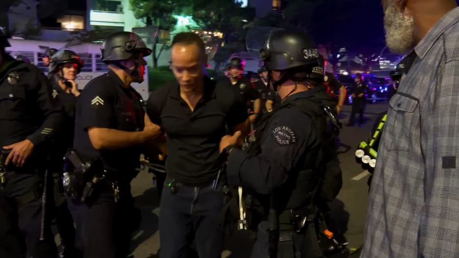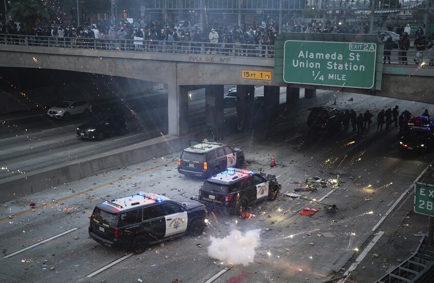 ألقت الشرطة الأمريكية القبض على عشرات المتظاهرين الذي خرجوا إلى شوارع لوس أنجلوس وكاليفورنيا، بعدما فرضت حظر تجوال على الولاية كاملة طوال ساعات الليل، إلا أن المتظاهرين رفضوا الإذعان للقرار الحكومي، وقرروا مواصلة تظاهراتهم.