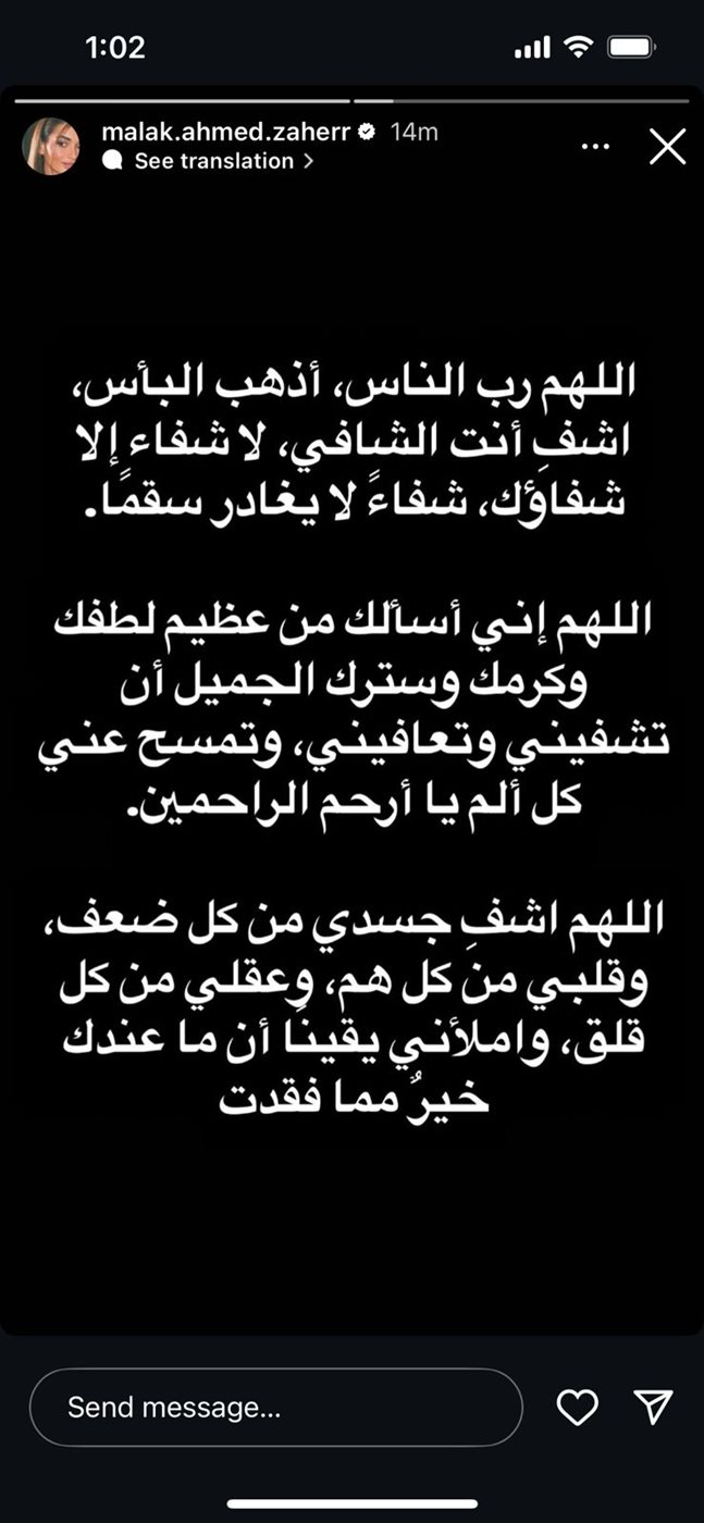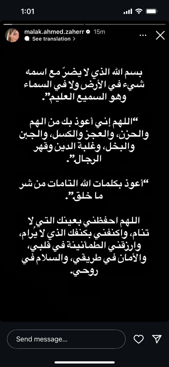 ونشرت ملك أحمد زاهر ستوري، عبر حسابها الشخصي بموقع تبادل الصور والفيديوهات القصيرة إنستجرام، جاء فيها: بسم الله الذي لا يضر مع اسمه شيء في الأرض ولا في السماء وهو السميع العليم، اللهم إني أعوذ بك من الهم والحزن، والعجز والكسل، والجبن والبخل، وغلبة الدين وقهر الرجال، وأعوذ بكلمات الله التامات من شر ما خلق.