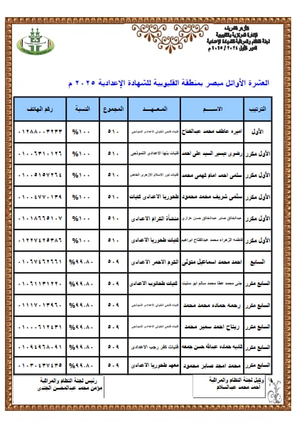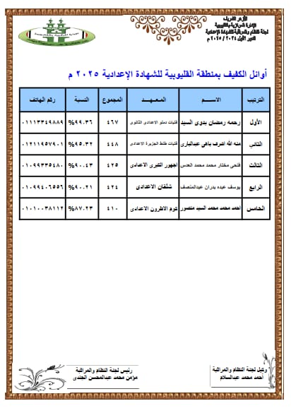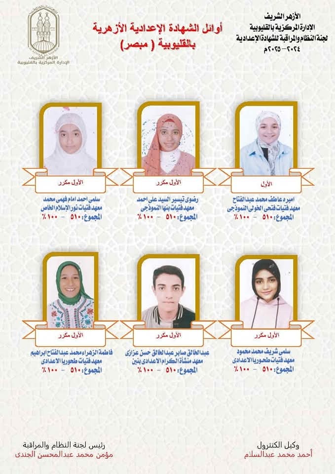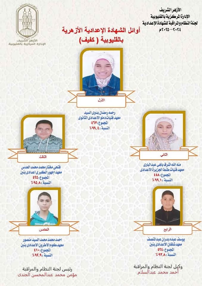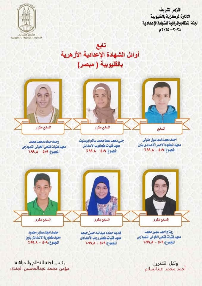 أسماء وصور أوائل الشهادة الإعدادية الأزهرية في القليوبية