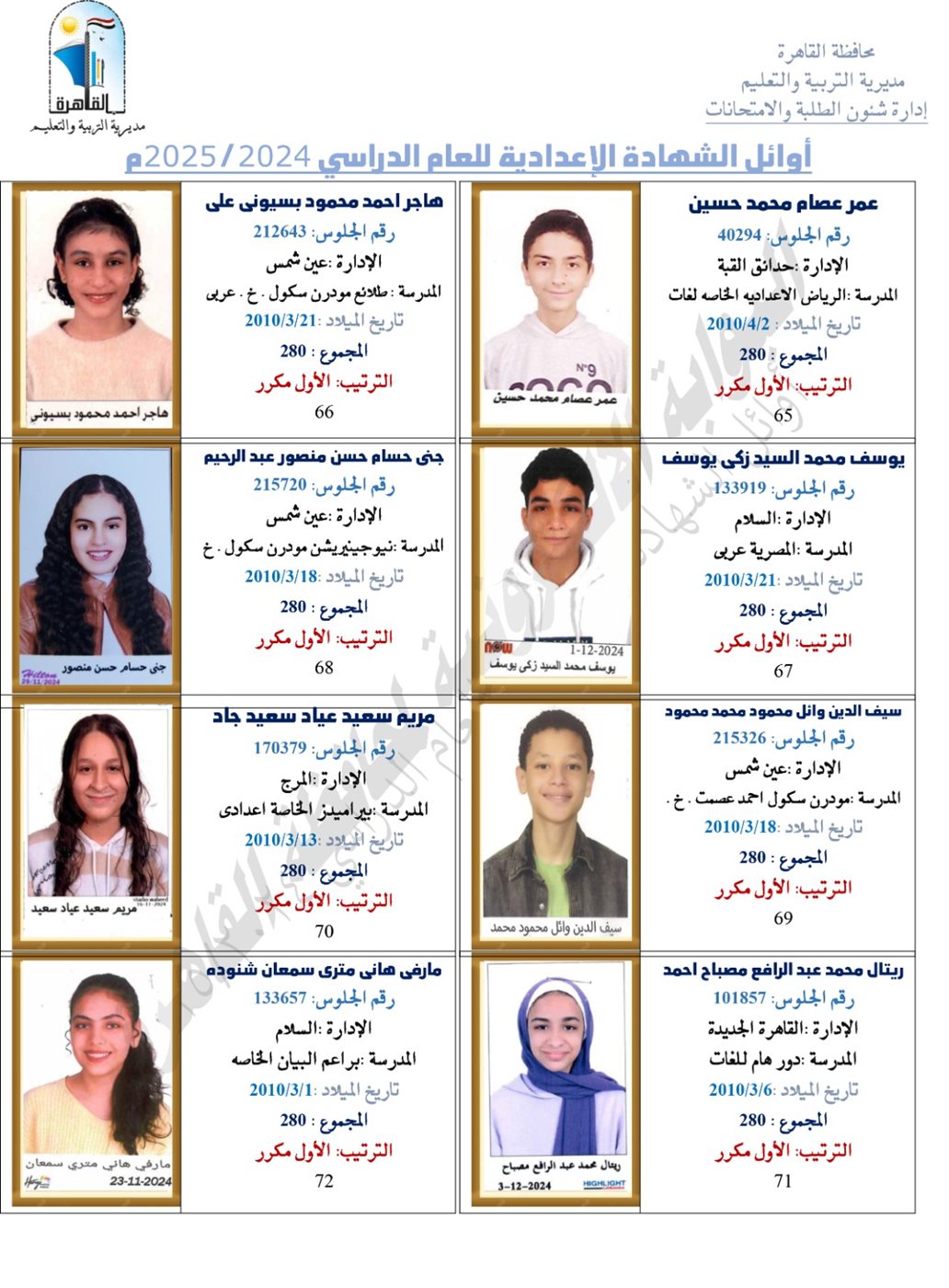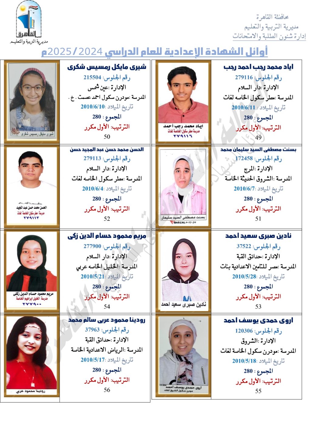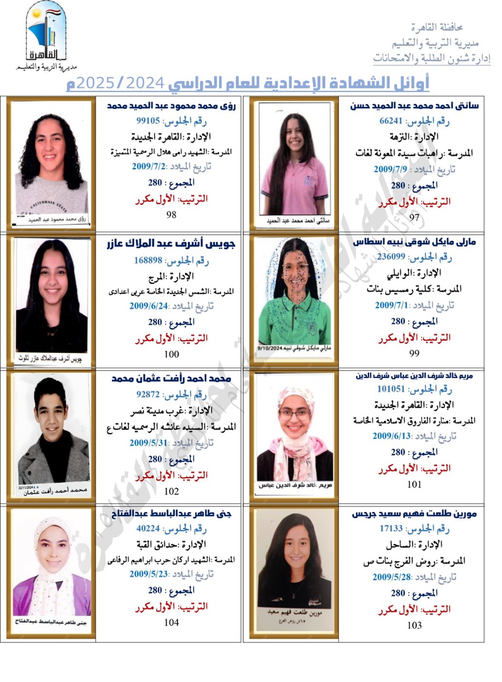 حلوان في الصدارة.. محافظة القاهرة تنشر أسماء وصور أوائل الشهادة الإعدادية | رابط النتيجة
