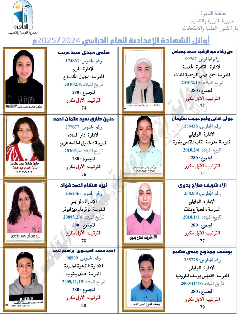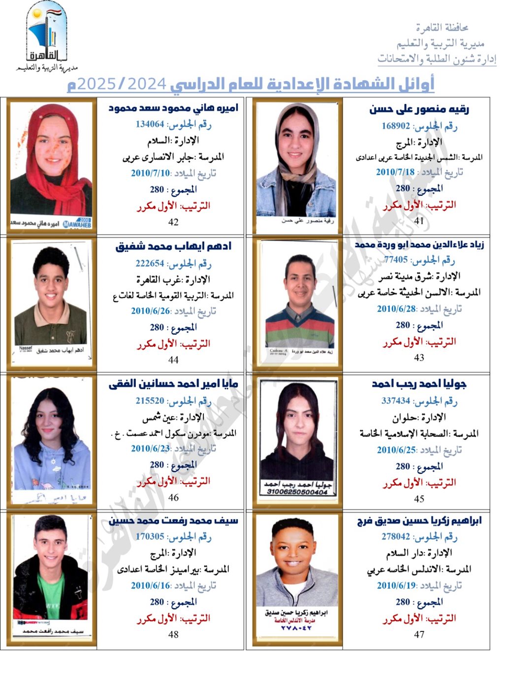 وكان محافظ القاهرة قد اعتمد نتيجة امتحانات الفصل الدراسي الثاني لشهادة إتمام التعليم الأساسى ( الشهادة الإعدادية) للعام الدراسي 2024- 2025بنسبة نجاح 77% ، حيث بلغ عدد المتقدمين ١٩٩٥٨٧ للامتحان طالب وطالبة حضر منهم ١٩٣٨٣٥ طالب وطالبة ونجح ١٤٩٢٥٧.