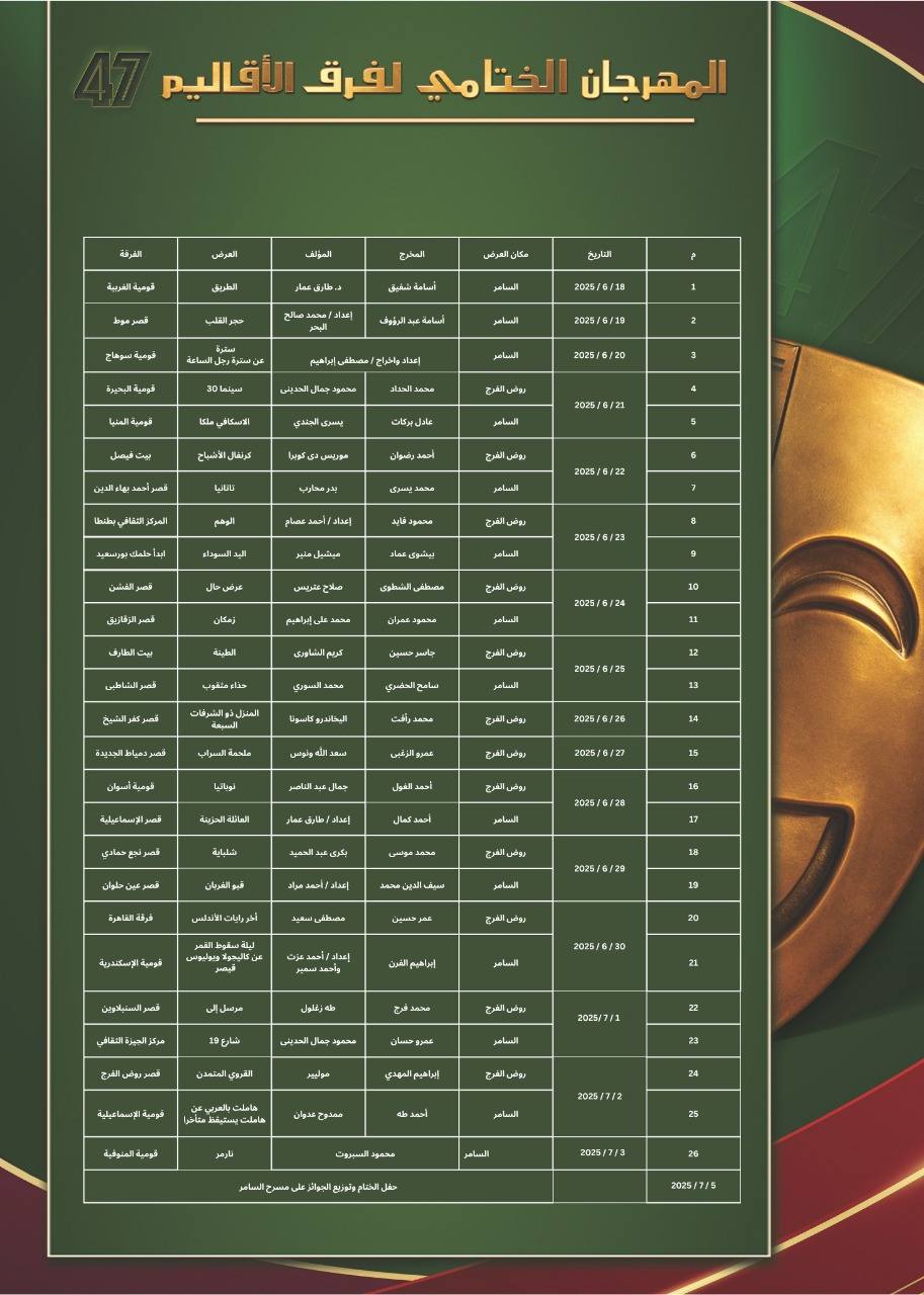 الليلة.. انطلاق المهرجان الختامي لفرق الأقاليم المسرحية في دورته الـ 47 بالسامر