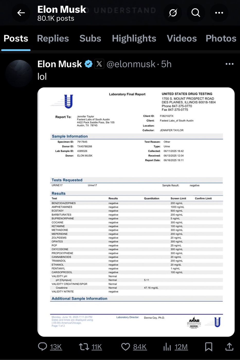 وحسب ما نشرته صحيفة ديلي ميل البريطانية، ظهر ماسك في منشور على منصة إكس، مُرفقًا بصورة لتحليل مخدرات سلبي لـ22 مادة مخدرة، بينها الفنتانيل، الكيتامين، الكوكايين، القنب، والإكستاسي، معلقًا بسخرية وأسلوب فكاهي: lol.. ردًا على الاتهامات، وقد أجري الاختبار في 11 يونيو لدى مركز Fastest Labs في جنوب أوستن، تكساس.
