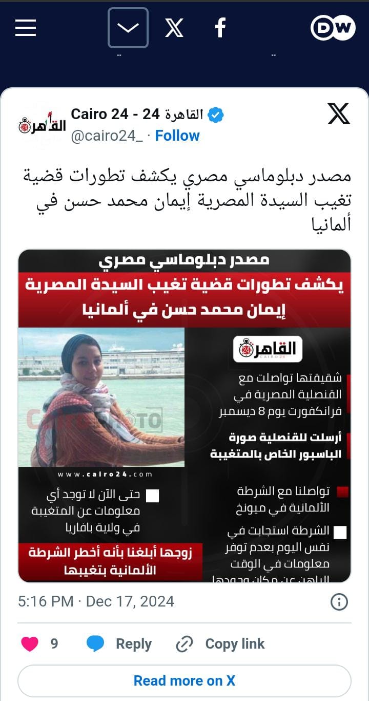 دويتشه فيله الألمانية تستعين بخبر حصري لـ القاهرة 24 في قضية اختفاء سيدة مصرية بألمانيا