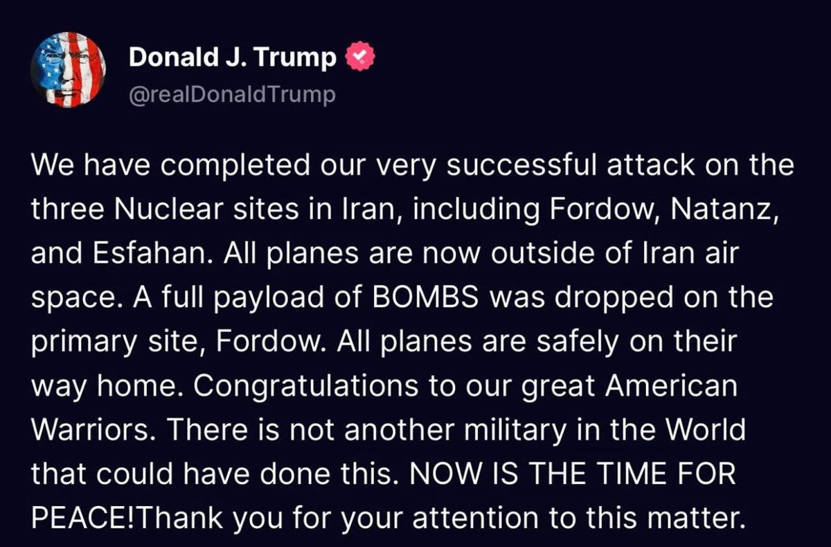 أعلن الرئيس الأمريكي دونالد ترامب عن القضاء على القدرات النووية لإيران تحت الأرض وقال حان وقت السلام.