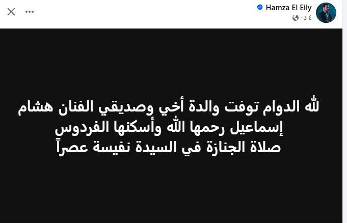 وأعلن الفنانة حمزة العيلي تفاصيل جنازة والد صديقه الفنان هشام إسماعيل، إذ قال عبر حسابه الشخصي بـ فيس بوك: لله الدوام توفت والدة أخي وصديقي الفنان هشام إسماعيل رحمها الله واسكنها فسيح جناته، صلاة الجنازة في السيدة نفيسة عصرا.