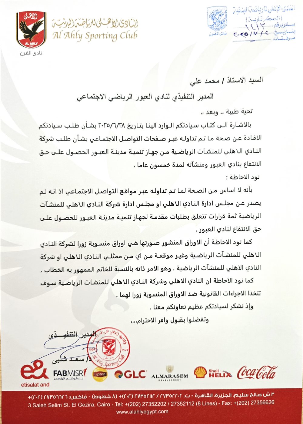 أرسل النادي الأهلي خطابا رسميا لنادي العبور، ينفي فيه المزاعم التي نشرت عبر مواقع التواصل الاجتماعي خلال الأيام الماضية، والتي تشير إلى إرسال شركة الأهلي للإنشاءات الرياضية خطابا إلى جهاز مدينة العبور، يطلب فيه الحصول على حق انتفاع لنادي العبور لمدة 50 سنة، الأمر الذي دفع نادي العبور إلى مخاطبة النادي الأهلي للتأكد من صحة تلك الأخبار المتداولة.