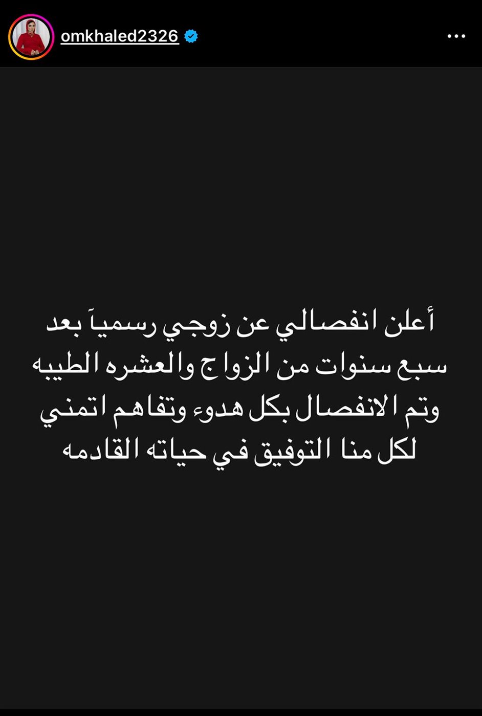 وخلال منشور رسمي عبر صفحتها الشخصية على إنستجرام، أوضحت أم خالد أن قرار الطلاق تم بـ كل هدوء وتفاهم، مؤكدة أن العلاقة انتهت بطريقة ودّية دون أي خلافات علنية، وأضافت: أتمنى لكل منا التوفيق في حياته المقبلة.