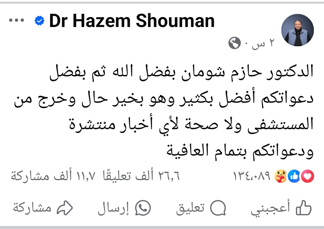 طمأنت الصفحة الرسمية للداعية حازم شومان محبيه بشأن حالته الصحية، بعد تعرضه لوعكة صحية استدعت دخوله المستشفى قائلة: الدكتور حازم شومان بفضل الله ثم بفضل دعواتكم أفضل بكثير وهو بخير حال وخرج من المستشفى ولا صحة لأي أخبار منتشرة ودعواتكم بتمام العافية.