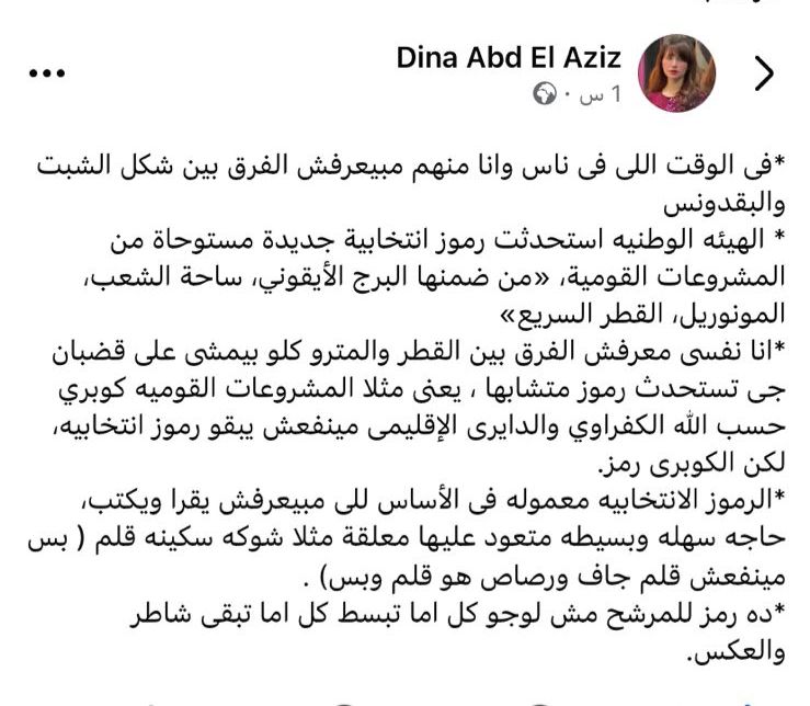 وأضافت: أنا نفسي معرفش الفرق بين القطر والمترو كله بيمشى على قضبان، جي تستحدث رموز متشابهة؟!، یعنى مثلًا المشروعات القومية كوبري حسب الله الكفراوي والدائري الإقليمي مينفعش يبقوا رموز انتخابية لكن الكوبرى رمز.