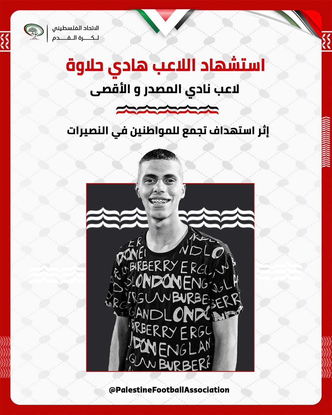 وقال الاتحاد الفلسطيني لكرة القدم في بيان رسمي: استشهاد اللاعب هادي حلاوة لاعب نادي المصدر والأقصى إثر استهداف تجمع للمواطنين في النصيرات.