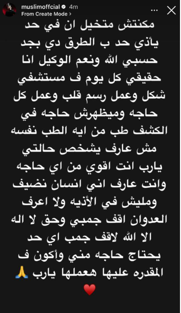 ونشر مسلم ستوري، عبر حسابه الشخصي بموقع انستجرام، قال فيها: مكنتش متخيل إن في حد يأذي حد بالطريقة دي، بجد حسبي الله ونعم الوكيل أنا حقيقي كل يوم في مستشفى شكل وعمل رسم قلب وعمل كل حاجة وميظهرش حاجة في الكشف، طب من إيه.. الطب نفسه مش عارف يشخص حالتي، يا رب أنت أقوى من أي حاجة، وأنت عارف إني إنسان نضيف ومليش في الأذية ولا أعرف العدوان، اقف جنبي وحق لا اله الا الله، أنا بقف جمب أي حد يحتاج حاجة مني، وأكون في المقدرة عليها هعملها يا رب.