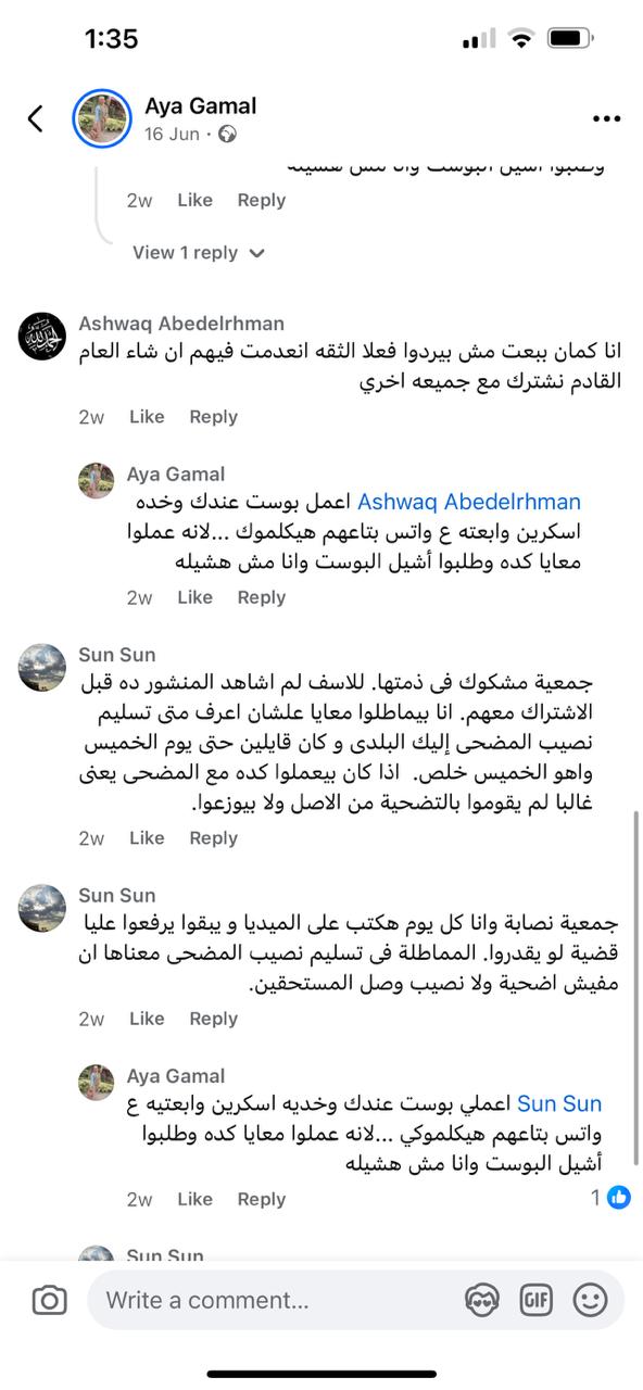 وتفاعل عدد من المستخدمين مع منشورها، مؤكدين تعرضهم لمواقف مشابهة، وعلّق أحدهم قائلًا: جمعية مشكوك في ذمتها، اتأخرت في تسليم نصيب الأضحية، ولو ما عملوش ده يوم الوقفة، يبقى ما عملوش أضحية أصلًا.