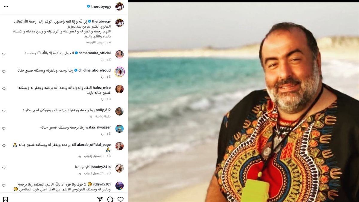 ونشرت روبي صورة للراحل، عبر حسابها الشخصي بـ انستجرام، وعلقت عليها: إن لله وإنا إليه راجعون، توفي إلى رحمة الله تعالى المخرج الكبير سامح عبدالعزيز