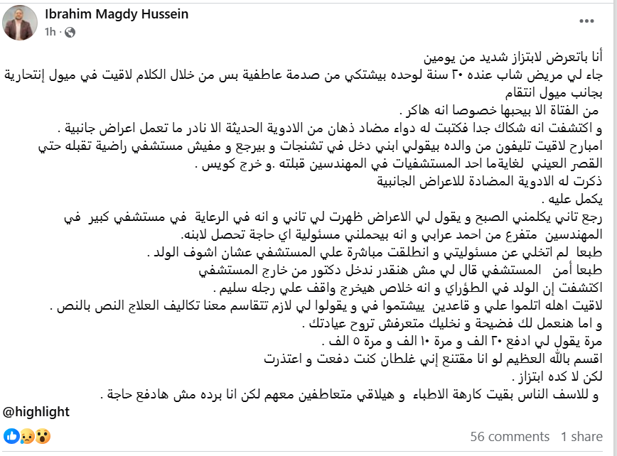 وأوضح الطبيب في البوست الذي نشره، أنه بعد تقييم الحالة النفسية للمريض، وصف له أحد أدوية مضادات الذُهان الحديثة، التي تُستخدم للتعامل مع الأعراض الذهانية والاضطرابات السلوكية، وتُعرف بندرة آثارها الجانبية، وبعد يومين من تلقي العلاج، تلقى الطبيب اتصالًا من والد المريض يبلغه بأن ابنه يعاني من تشنجات وقيء حاد، وجرى نقله إلى عدة مستشفيات لم تستقبله، قبل أن يقبله أحد المستشفيات بمنطقة المهندسين، إذ تحسنت حالته وخرج على قدميه في حالة جيدة.