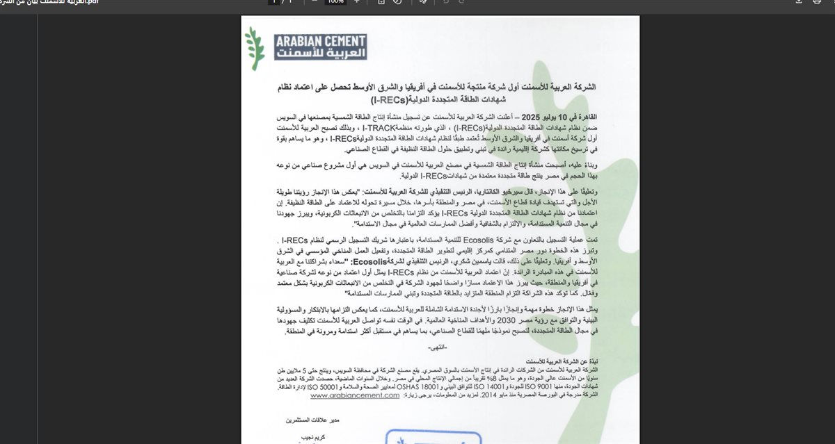 يمثل هذا الإنجاز خطوة مهمة وإنجازا بارزا لأجندة الاستدامة الشاملة للعربية للأسمنت، كما يعكس التزامها بالابتكار والمسؤولية البيئية والتوافق مع رؤية مصر 2030 والأهداف المناخية العالمية. في الوقت نفسه تواصل العربية للأسمنت تكثيف جهودها في مجال الطاقة المتجددة، لتصبح نموذجا ملهما للقطاع الصناعي، بما يساهم في مستقبل أكثر استدامة ومرونة في المنطقة.