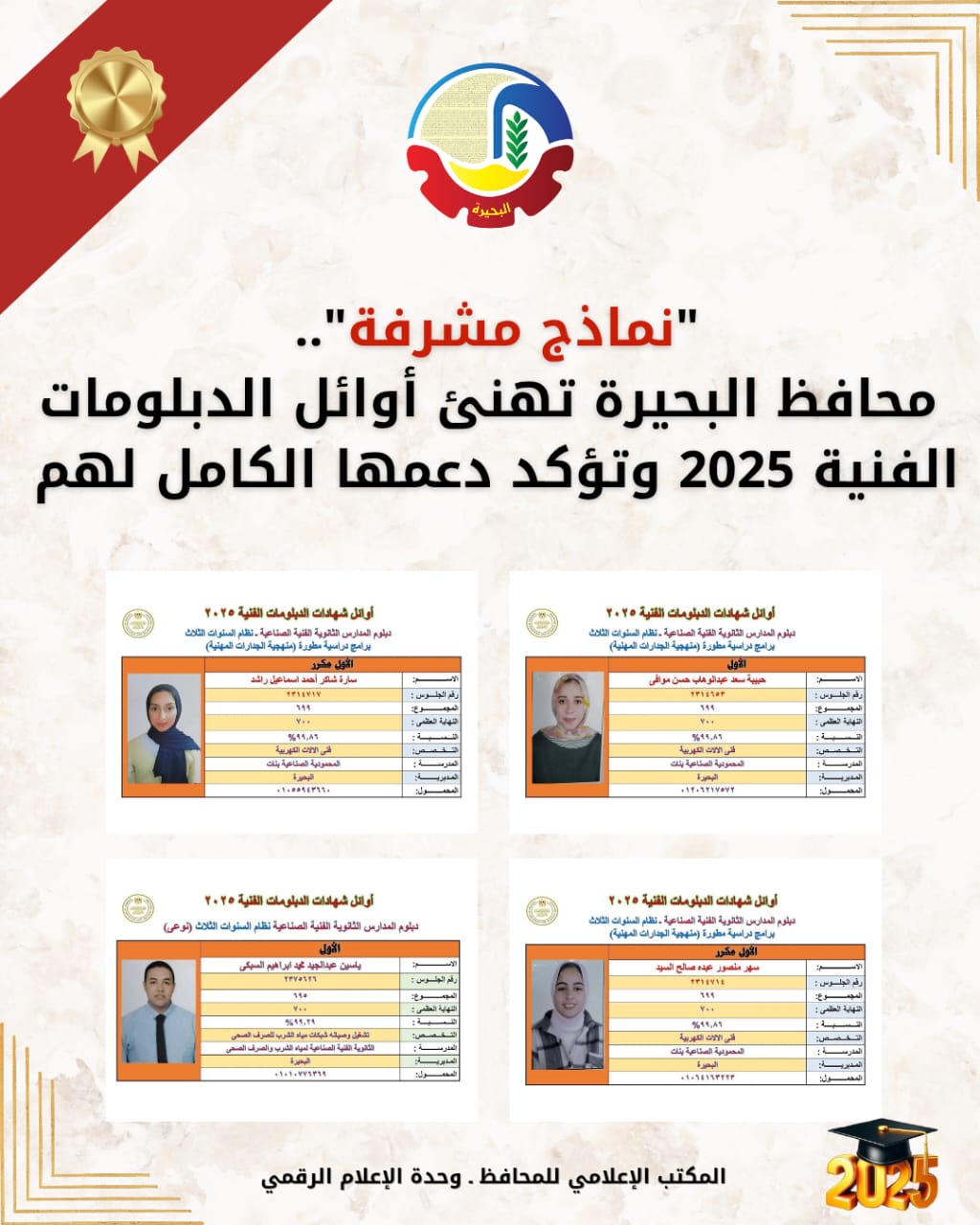 محافظ البحيرة تهنئ أوائل الدبلومات الفنية وتؤكد دعمها الكامل لهم
