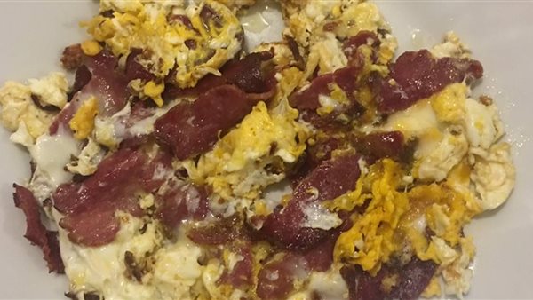 - يخفق البيض مع رشة الملح والفلفل ثم يوضع على البسطرمة مع التقليب.