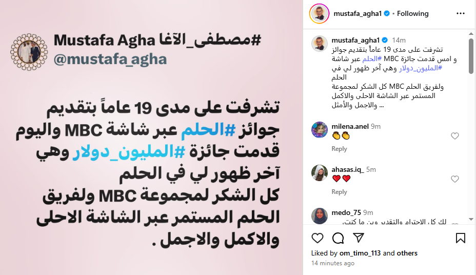 وكتب مصطفى الأغا منشورا، عبر حسابه الرسمي بـ انستجرام، قال فيه: تشرفت على مدى 19 عاما بتقديم جوائز الحلم عبر شاشة MBC، وأمس قدمت جائزة المليون دولار، وهي آخر ظهور لي في الحلم، كل الشكر لمجموعة MBC ولفريق الحلم المستمر عبر الشاشة الأحلى والأكمل والأجمل والأمثل.