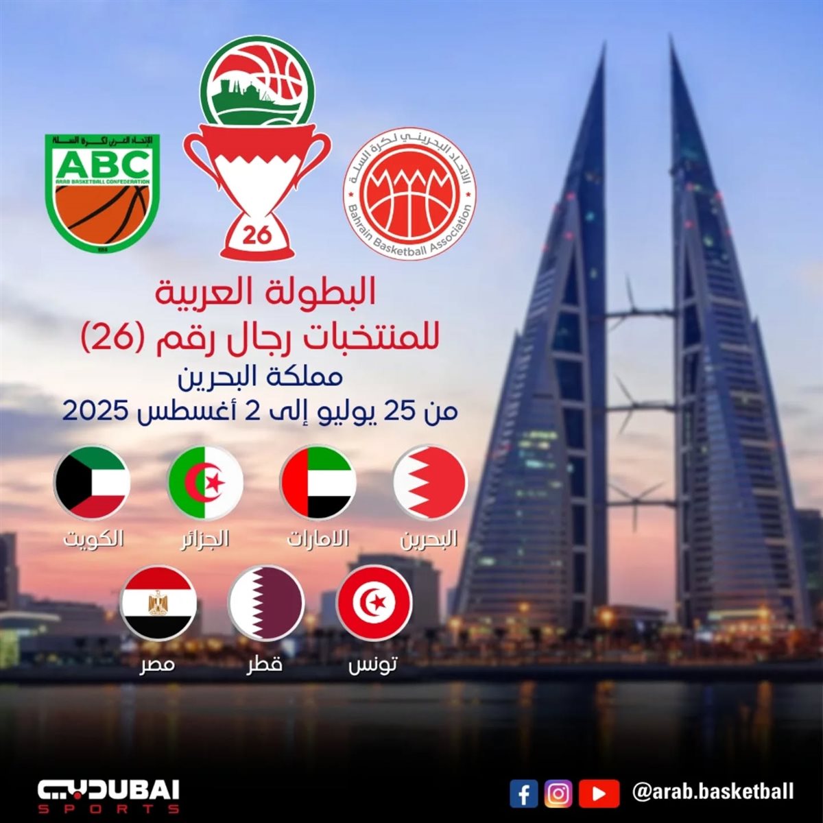 وتنطلق منافسات البطولة العربية للمنتخبات رجال في نسختها الـ 26 في الفترة من 26 يوليو حتى 2 أغسطس المقبل، بمملكة البحرين بمشاركة منتخبات البحرين- الإمارات- الجزائر- الكويت- تونس- قطر- مصر.